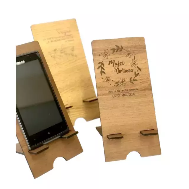 Apoya celular de madera Fibroplus con grabado láser y versículo. Ideal para escritorio o regalo Día del Padre. Añadí fe y diseño a tu espacio hoy.